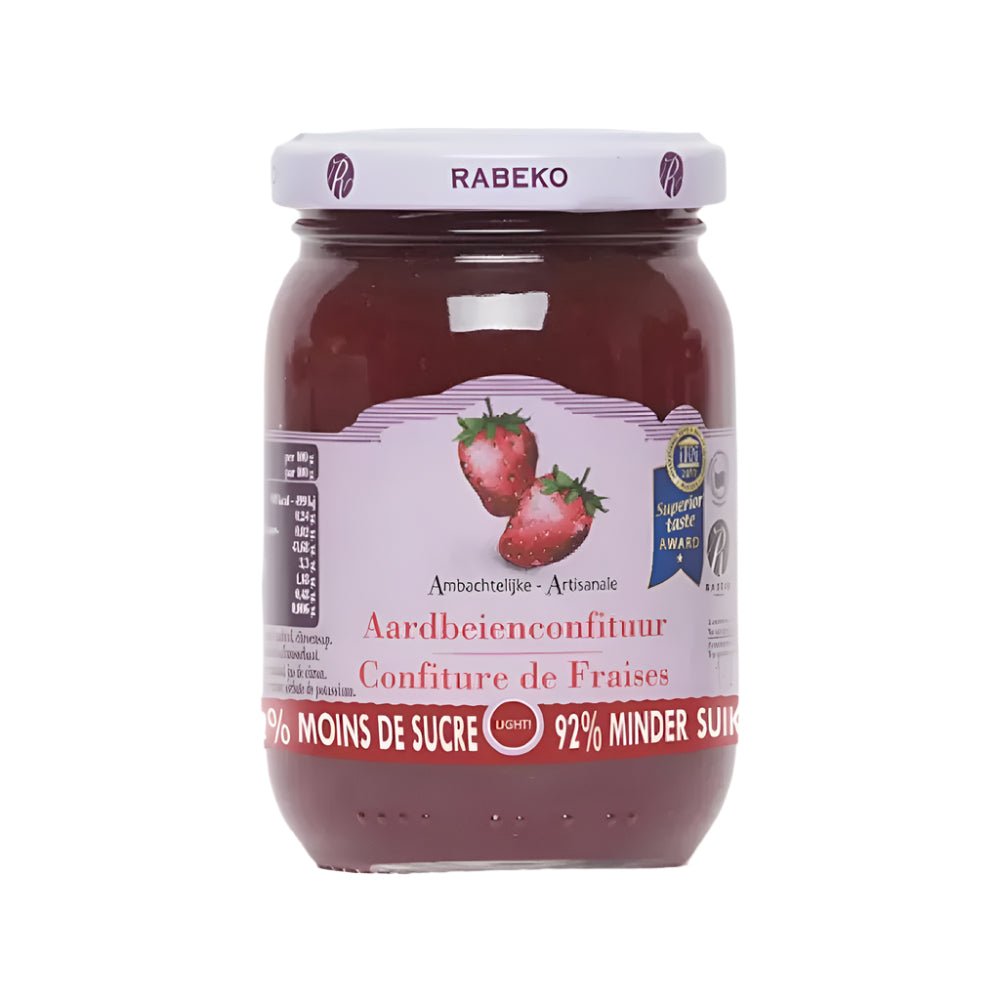 Rabeko Jam 92% less Sugar este alegerea perfecta pentru cei care isi doresc un gem delicios, dar cu un continut caloric scazut si fara adaosuri de zahar. Cu doar 8 kcal per portie si o cantitate ridicata de fibre, acest gem contribuie la mentinerea senzatiei de satietate si sustine un stil de viata sanatos si echilibrat. Este realizat artizanal in Belgia, folosind fructe reale si indulcitori de calitate, fiind potrivit pentru dietele fara gluten, fara lactoza si pentru regimul vegan.
