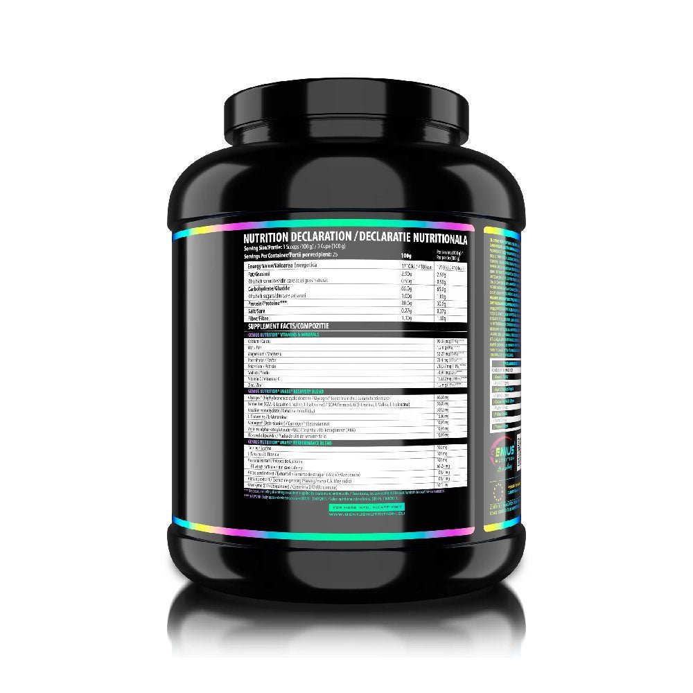 Ingrediente capsuni: Faina instant de ovaz, concentrat proteic din zer, hidrolizat proteic din zer, izolat proteic din zer CFM instant (din lapte), complex inteligent pentru refacere (dextrina ciclica foarte ramificata, creatina monohidrat, l-leucina, l-valina, i-izoleucina, beta-alanina, faina de seminte de in, arginina-AKG, arginina HCL, l-alanil l-glutamina, taurina), complex inteligent pentru performanta (tirozina, inozina, vitamina C (acid ascorbic), extract de guarana, extract de seminte de struguri, extract de ginseng, coenzima-Q10), agenti de aromatizare, pudra de sfecla rosie, indulcitori (sucraloza, glicozide din steviol).