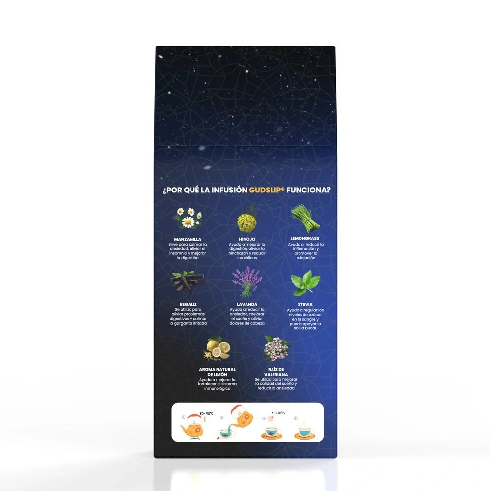 Gudslip Sweet Dreams este o infuzie vegetala premium creata pentru a sustine relaxarea naturala si imbunatatirea calitatii somnului. Cu o combinatie puternica de musetel, lavanda, lemongrass si radacina de valeriana, acest amestec ajuta corpul sa se pregateasca pentru un somn odihnitor, sprijinind atat calmarea sistemului nervos, cat si atingerea fazei REM – esentiala pentru regenerarea fizica si mentala.